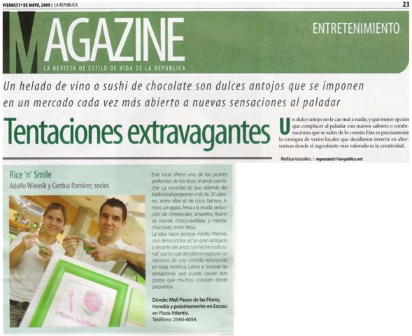 "Atrévase a variar el tradicional sabor de canela y pasas. Aqui podrá hacerlo!" - así empieza el artículo publicado por Revista Perfil en su edición de Marzo 2009. El periodista Olman Castro y el fotógrafo Rodrigo Montoya se dieron una visita por nuestro kiosco en Paseo de las Flores en Heredia y cada uno en lo suyo, supieron transmitir perfectamente las sensaciones que queremos que nuestra clientela disfrute al estar en nuestros locales y probar nuestro producto.
